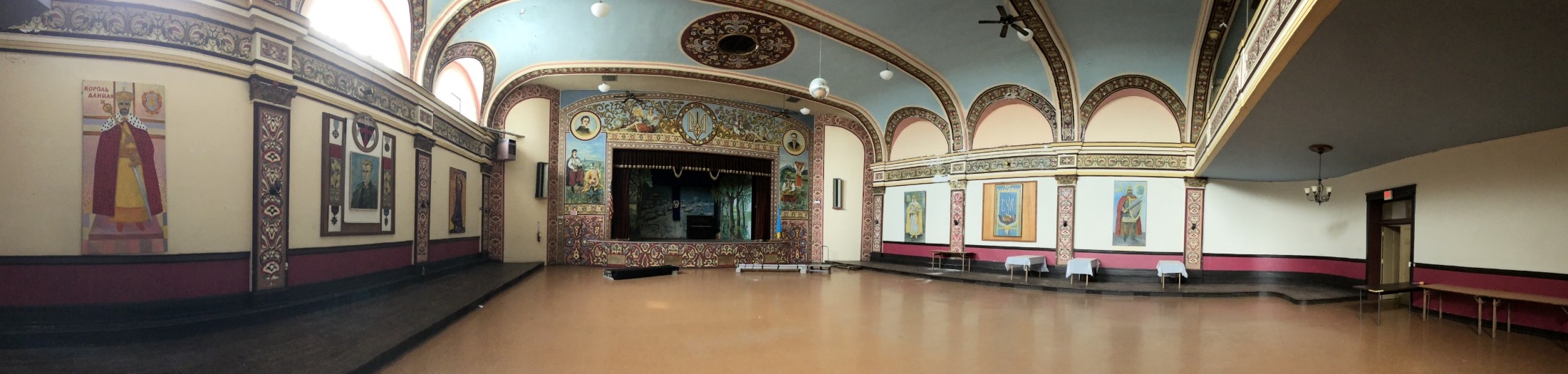 The Heart of Dnipro, featuring hand painted floor-to-ceiling murals and 26' tall ceilings. Our main stage can accommodate live music or a performance. Includes access to secure parking lot and 2nd floor bathrooms; and 2nd floor Bar and Lounge, VIP, and catering rooms by request. Max 350 people. Ask about long-term lease or periodical availability.